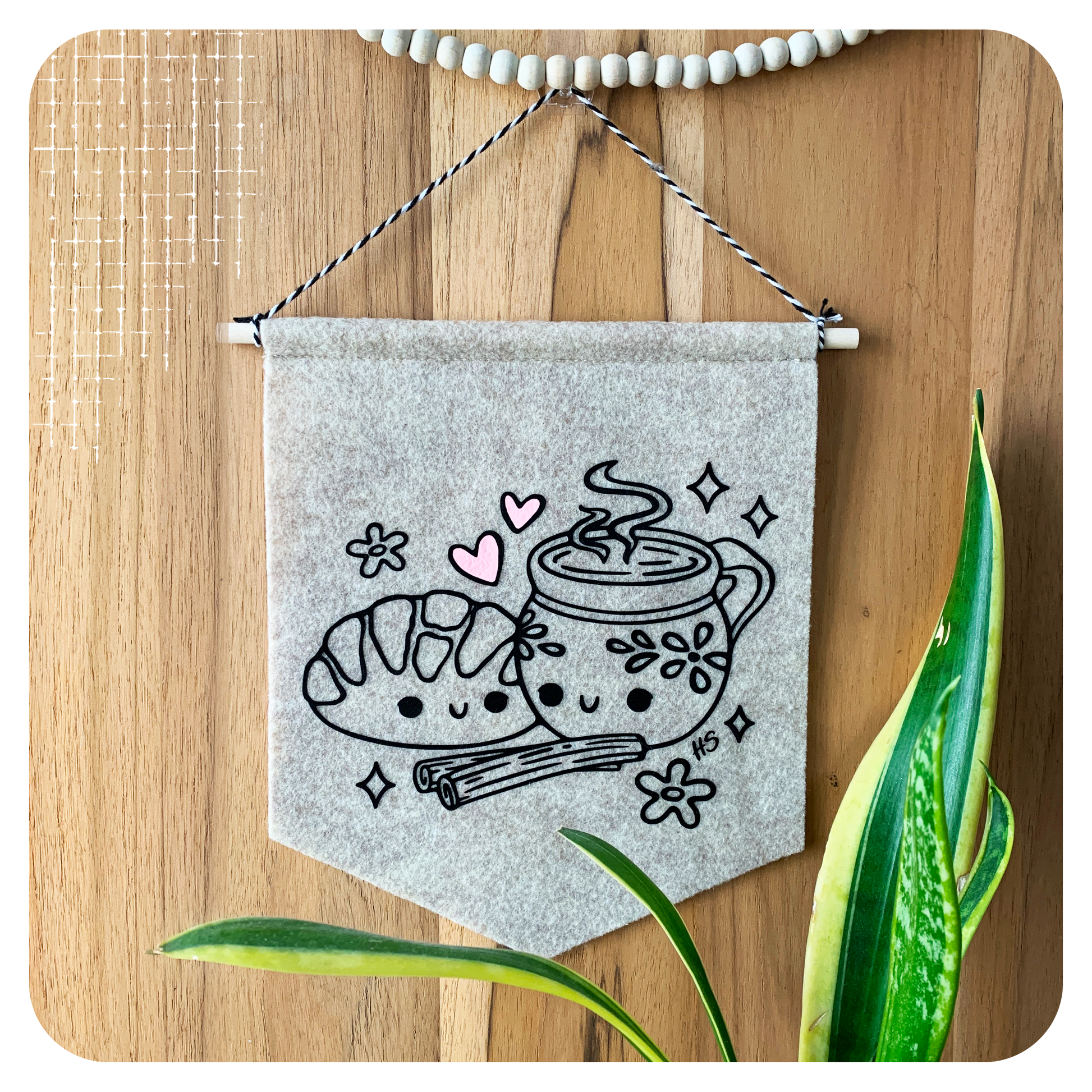 A cafe de olla and a concha make the perfect duo. Add it as part of your home decor to any room or office space. Each felt flag is designed and assembled in my small, home studio.
