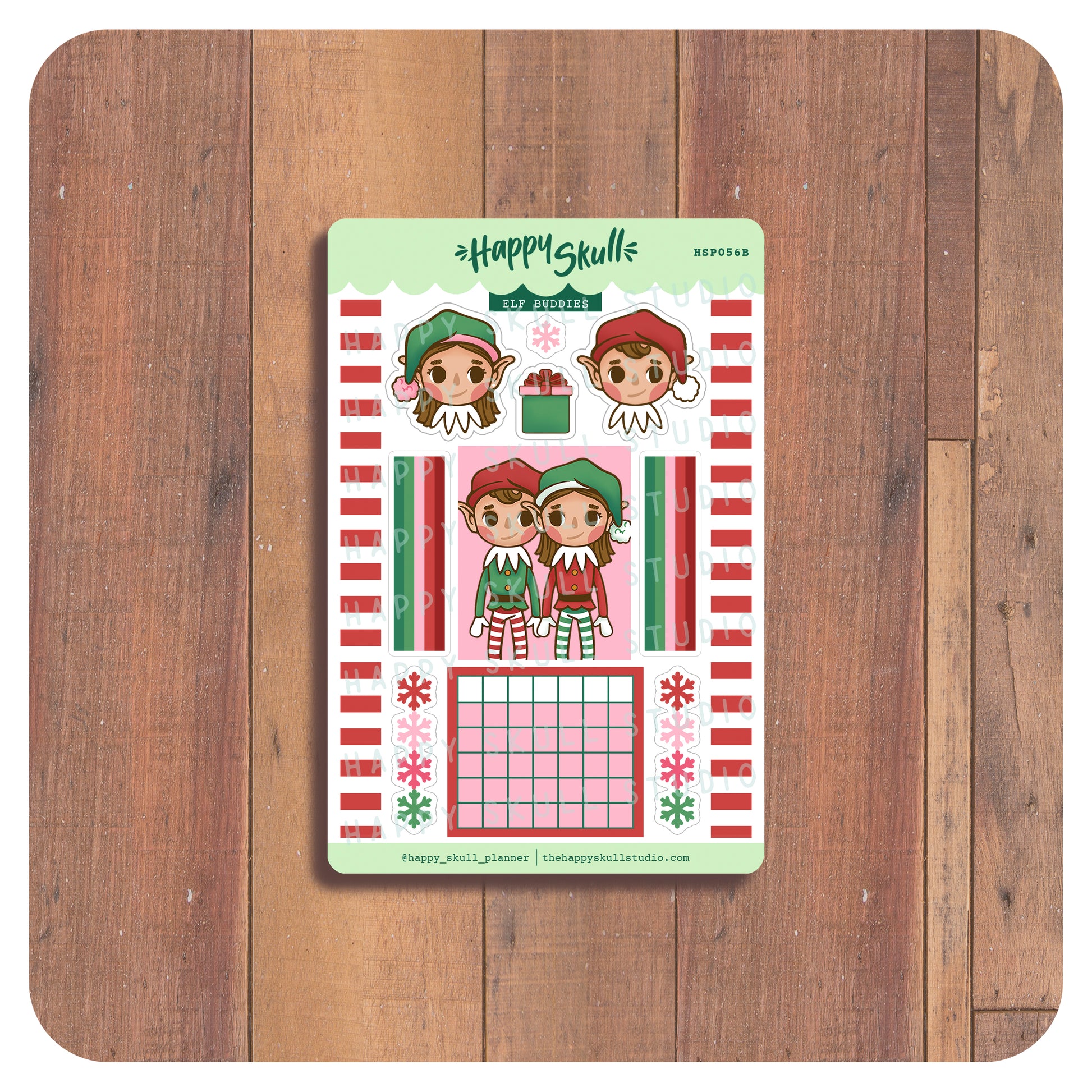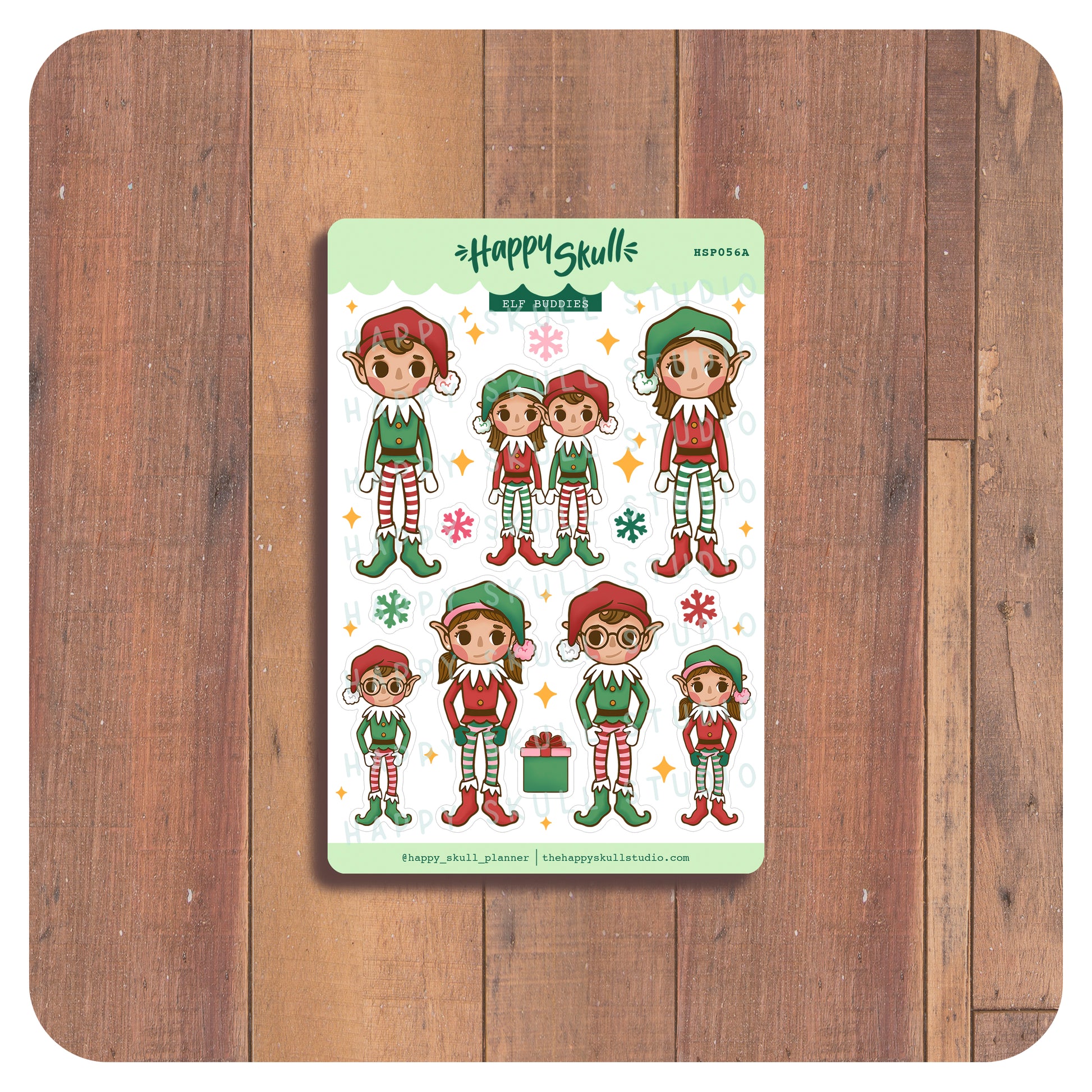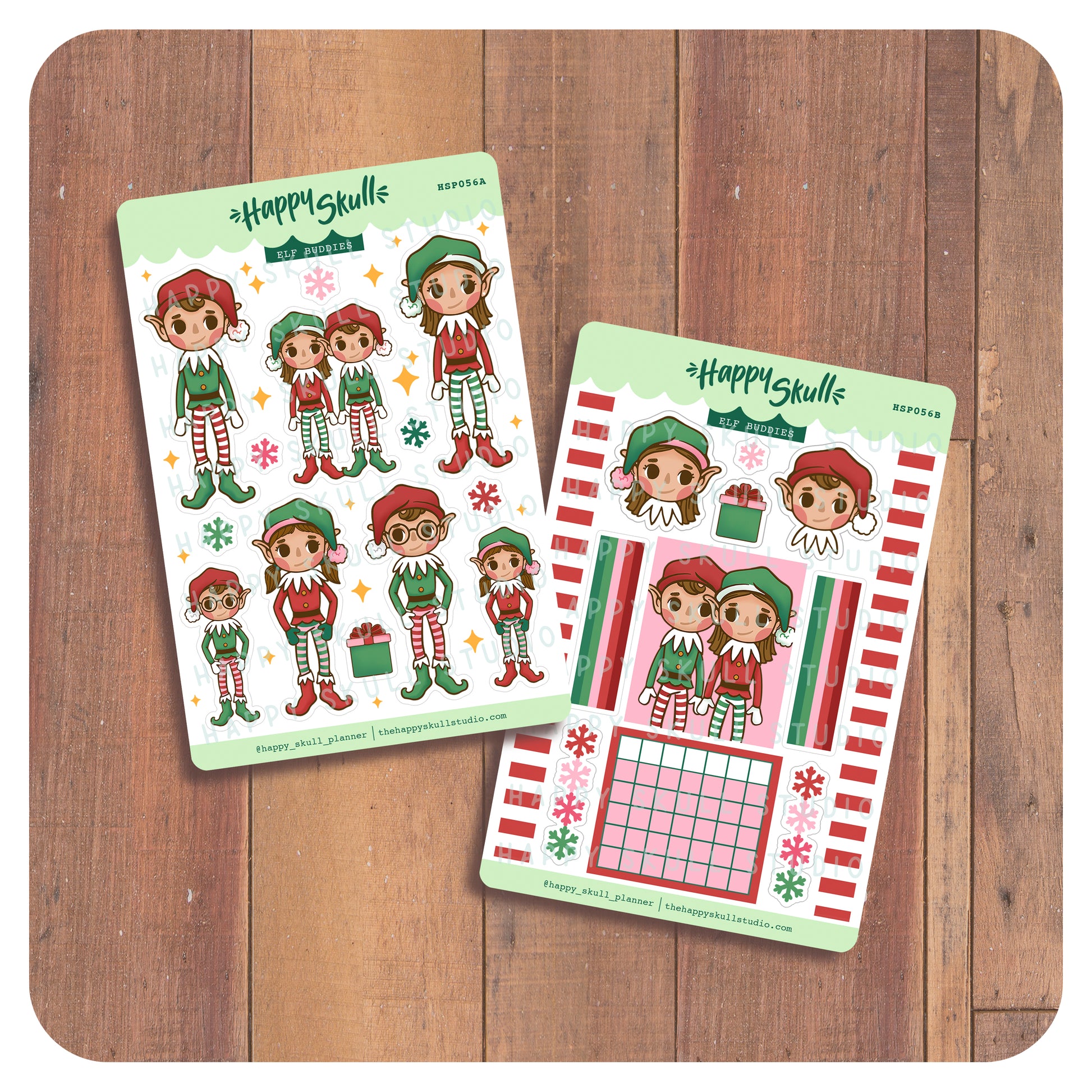 Elf Buddies sticker sheets are an original collection by The Happy Skull Studio. All stickers are kiss cut for easy peeling. Set your goals, important lists, and appointments with these beautiful stickers. All sheets are designed, printed, and cut in my home studio. Stickers are printed on premium sticker paper but are not waterproof.