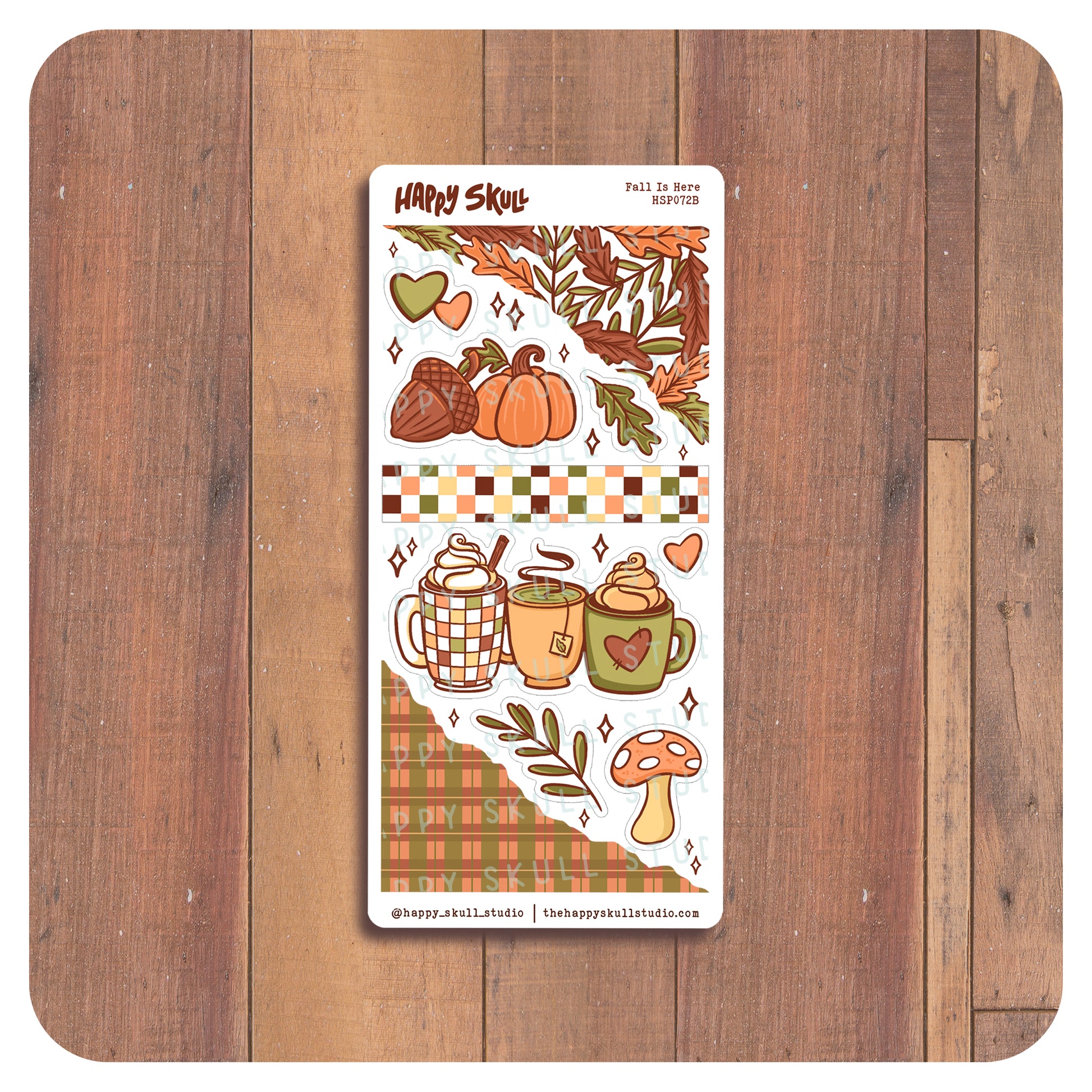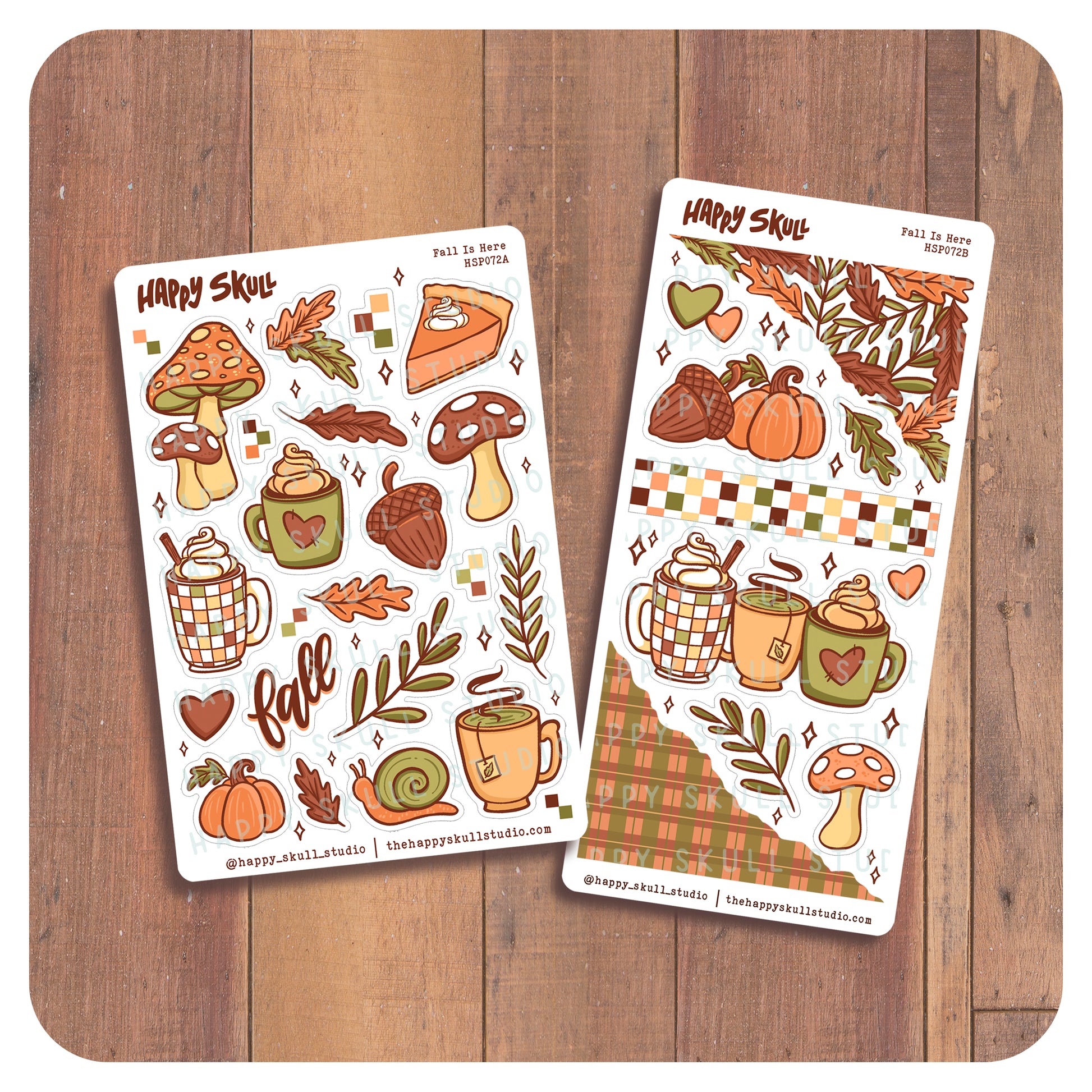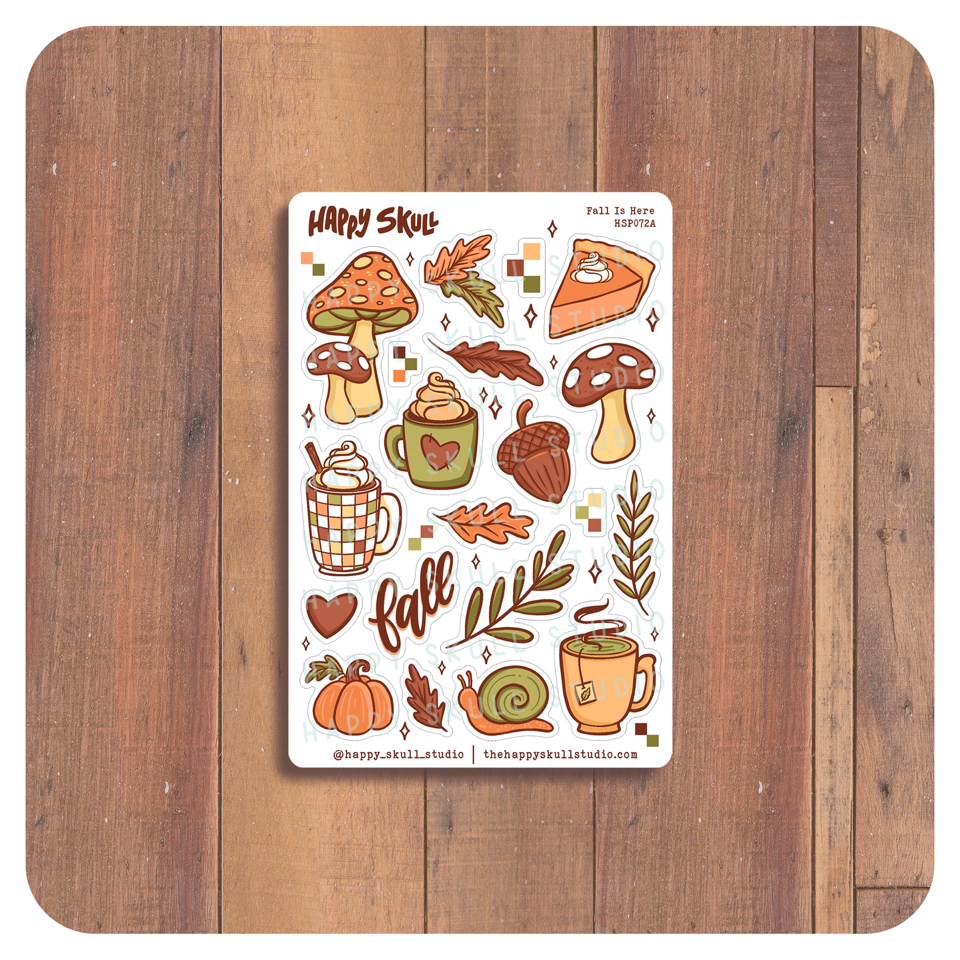 Fall is Here sticker sheets are an original collection by The Happy Skull Studio. All stickers are kiss cut for easy peeling. Set your goals, important lists, and appointments with these happy stickers. All sheets are designed, printed, and cut in my home studio. Stickers are printed on premium sticker paper but are not waterproof.