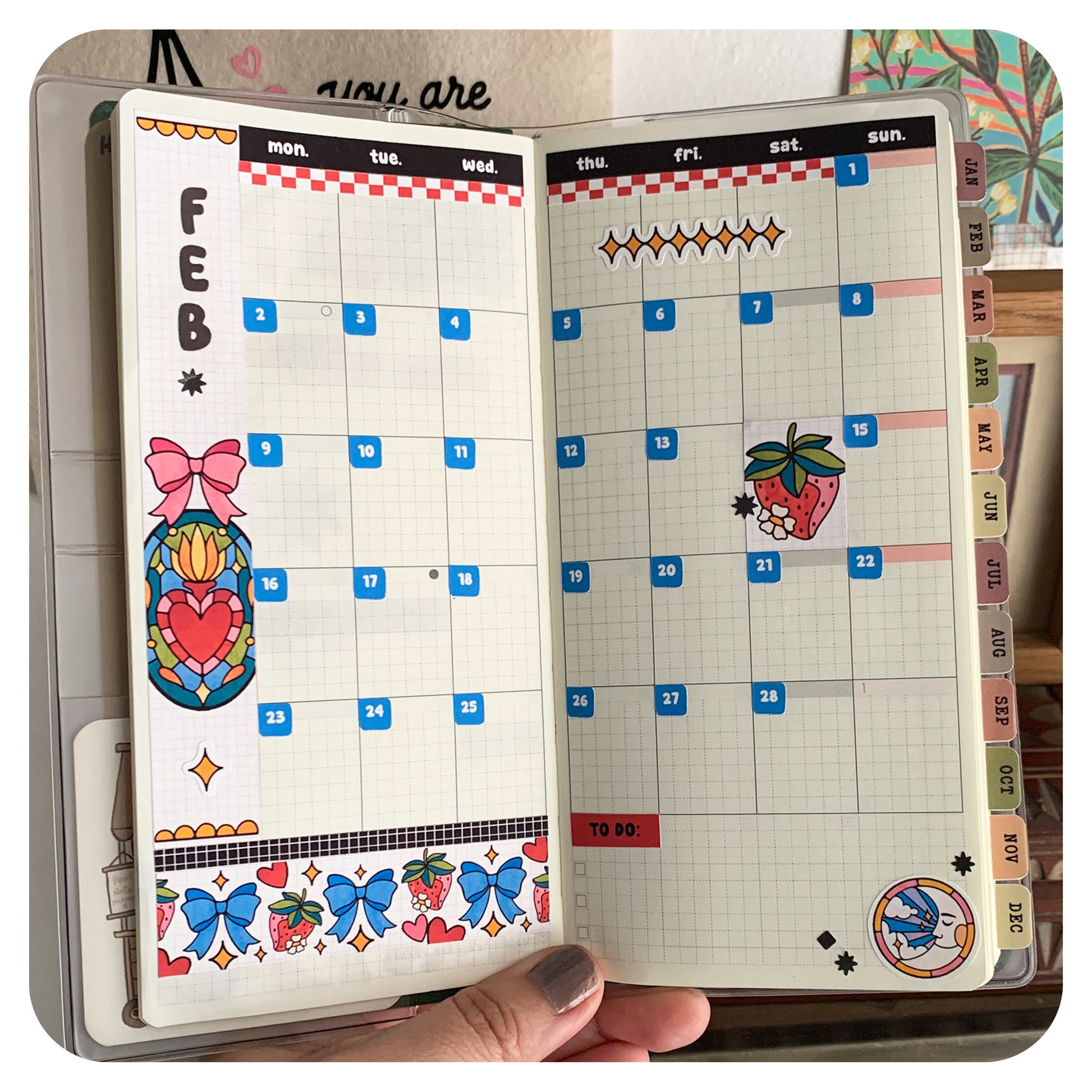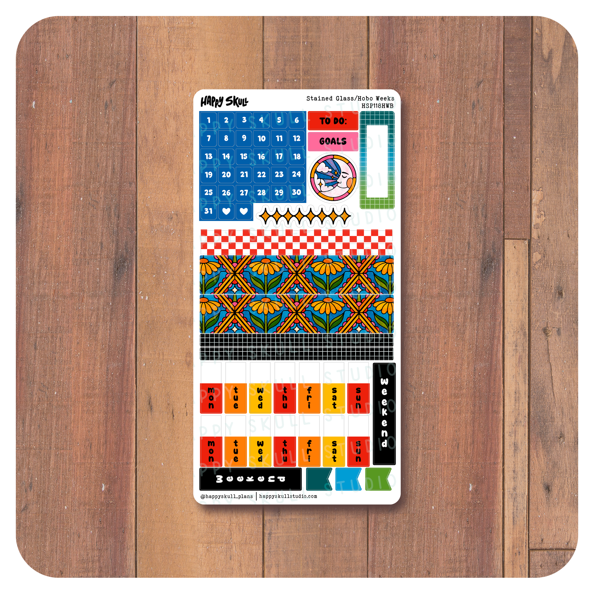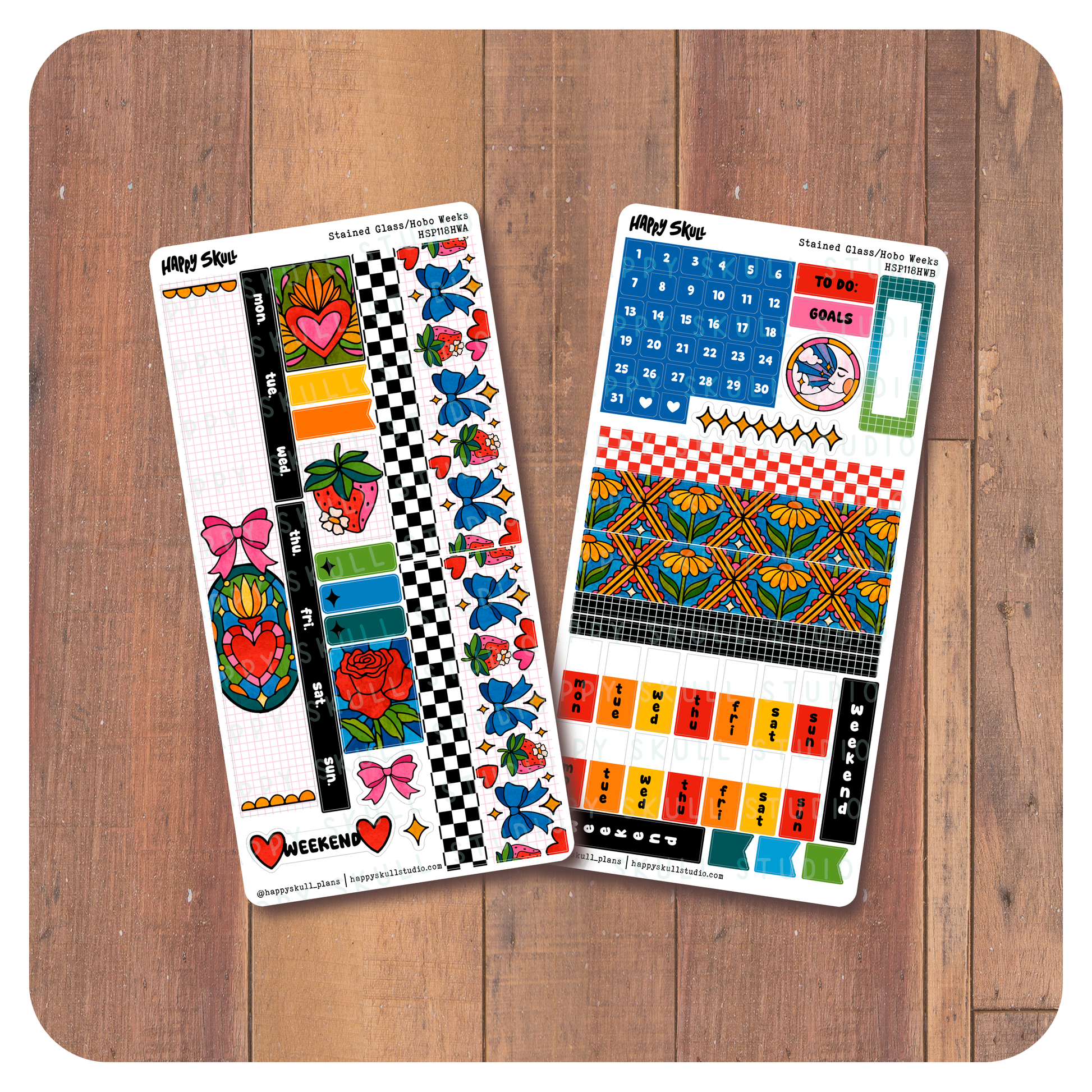 Stained Glass is an exclusive, Happy Skull design. This 2 page, Hobonichi Weeks kit has a bit of everything. Kit includes decorative elements, borders, labels, flags, numbers, and decorative boxes. Our Bubble Month stickers in clear matte make this kit usable for any time of the year.